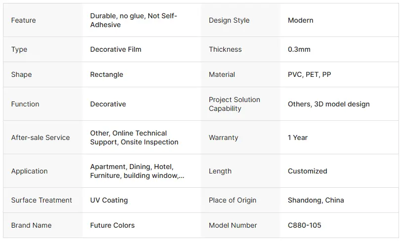 मॉडर्न सॉलिड कलर ब्लिस्टर फिल्म ही एक सजावटीची फिल्म सामग्री आहे जी बेस मटेरियल म्हणून उच्च-आण्विक प्लास्टिक वापरते. रंगीत आणि कोटिंग उपचारानंतर, ते "फोड प्रक्रिया" (व्हॅक्यूम or क्सॉर्प्शन मोल्डिंग) च्या माध्यमातून आसंजन साध्य करते. यात "एकसमान रंग, मजबूत प्लॅस्टीसीटी आणि उच्च खर्च-प्रभावीपणा" आहे आणि फर्निचर, सजावट आणि पॅकेजिंग सारख्या क्षेत्रात मोठ्या प्रमाणात वापरला जातो. हे आधुनिक किमान शैलीतील डिझाइनमधील सामान्यतः वापरल्या जाणार्या सामग्रीपैकी एक आहे.